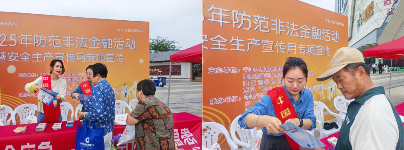 6月13日,平安养老保险股份有限公司(以下简称“平安养老险”)芜湖中心支公司联合在芜平安集团其他专业公司,围绕“守住钱袋子·护好幸福家”主题,在万达广场开展防范非法金融宣传月活动。
