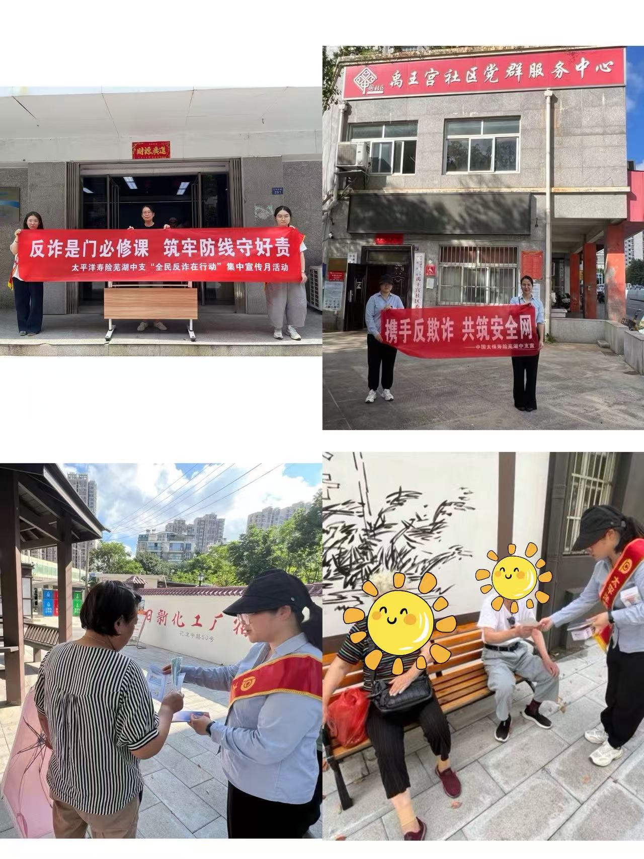 为切实提升全民识诈防诈反诈意识和能力,筑牢防范诈骗“防火墙”,中国太保寿险芜湖中心支公司积极开展以“反诈是门必修课,筑牢防线守好责”为主题的“全民反诈在行动”集中宣传月活动,组织员工走进社区、进学校、进商圈开展反诈知识宣传活动,营造浓厚的反诈宣传氛围,切实守护群众的“钱袋子”。