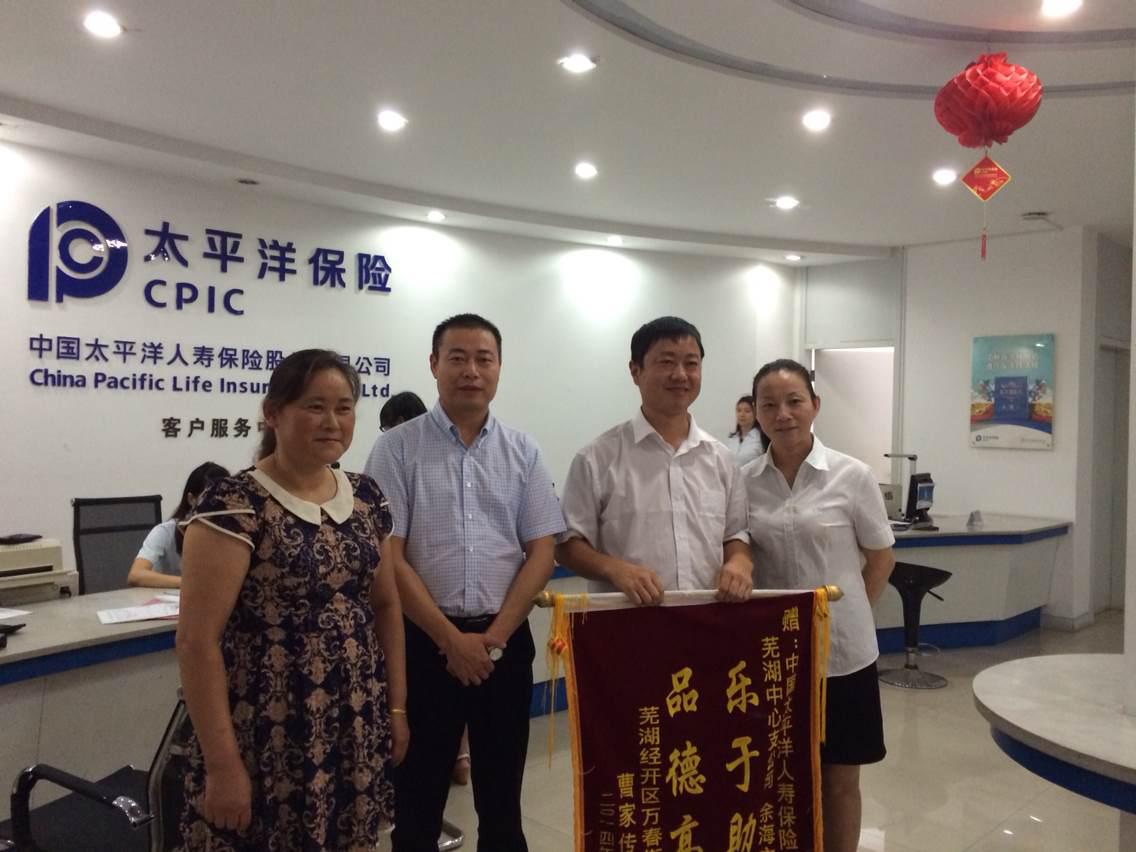 太平洋寿险芜湖中支个险部主管余海在上班途中看到一起电动车与摩托车相撞的车祸,凭借自己从医经验,疏散围观人群,仔细检查伤者受伤情况,并积极配合120医护人员将伤者送上救护车,与医护人员进行沟通,提出就近进行急救。后经主治医生告知,余海大胆施救,为伤者争取了宝贵的10分钟。8月26日上午,伤者家属来到太平洋寿险公司表示感谢,太平洋寿险芜湖中支总经理吴波对余海救人行为进行了表扬,在团队中起到了模范作用,号召全司员工学习余海乐于助人的精神,承担起应有的社会责任,面向社会用心承诺、用爱负责。