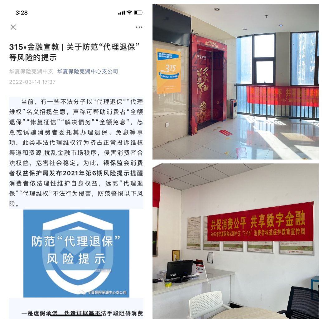 因受疫情影响,华夏保险芜湖中支积极响应政府疫情防控要求,及时取消线下户外宣传安排,改为以线上宣传教育为此次宣传周的主要活动形式。在各机构网点悬挂宣传横幅、张贴海报,向客户及员工展示消费者权益宣传周的活动主题,对前来办理业务的消费者进行相关金融知识宣讲。并通过中支微信公众号,发布“以案说险”、消费者权益等主题文章。同时还组织全体内外勤人员邀约客户参与安徽保险业“3·15”保险知识有奖问答,有效提升员工及客户对保险权益保护的知识积累,对公司发展和社会和谐起到了积极的推动作用。